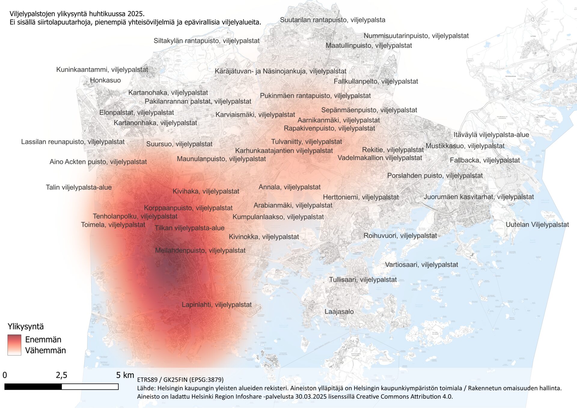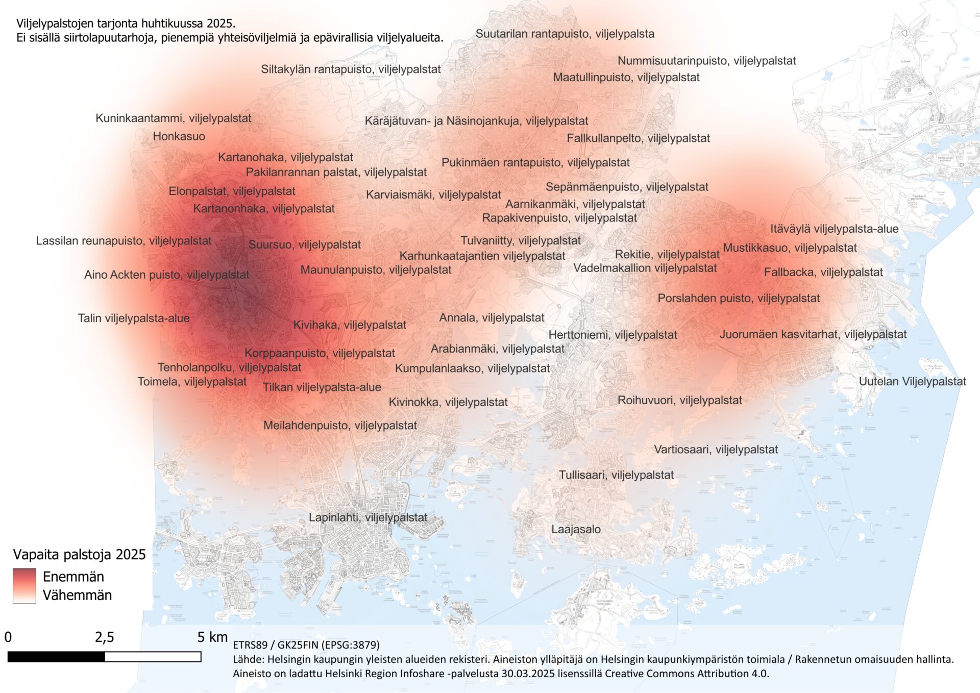 Kuva 1. Palstaviljelmät ja viljelyalueet Helsingissä huhtikuussa 2025.